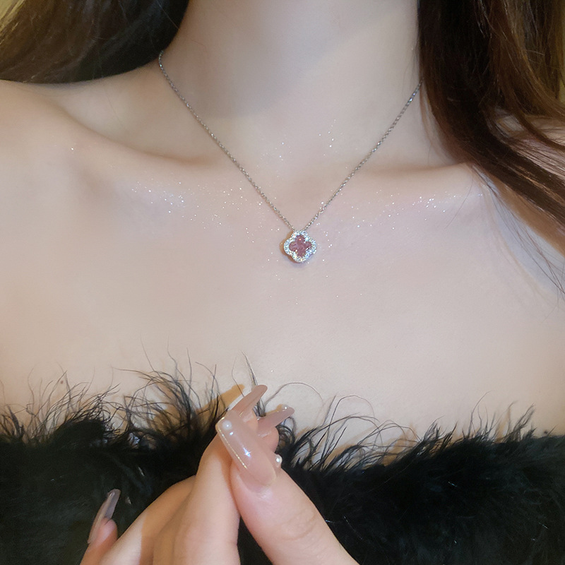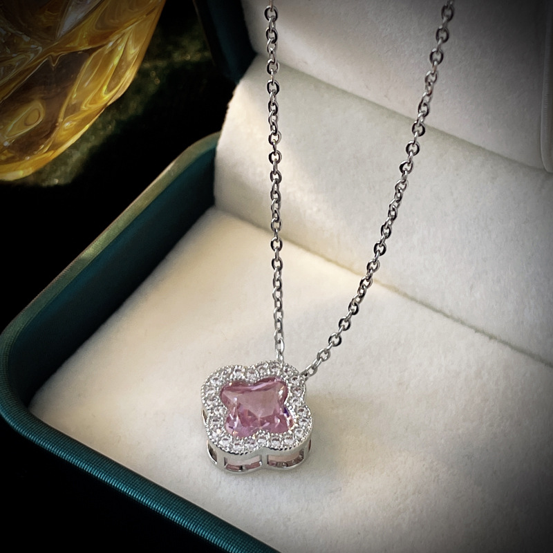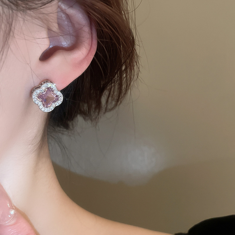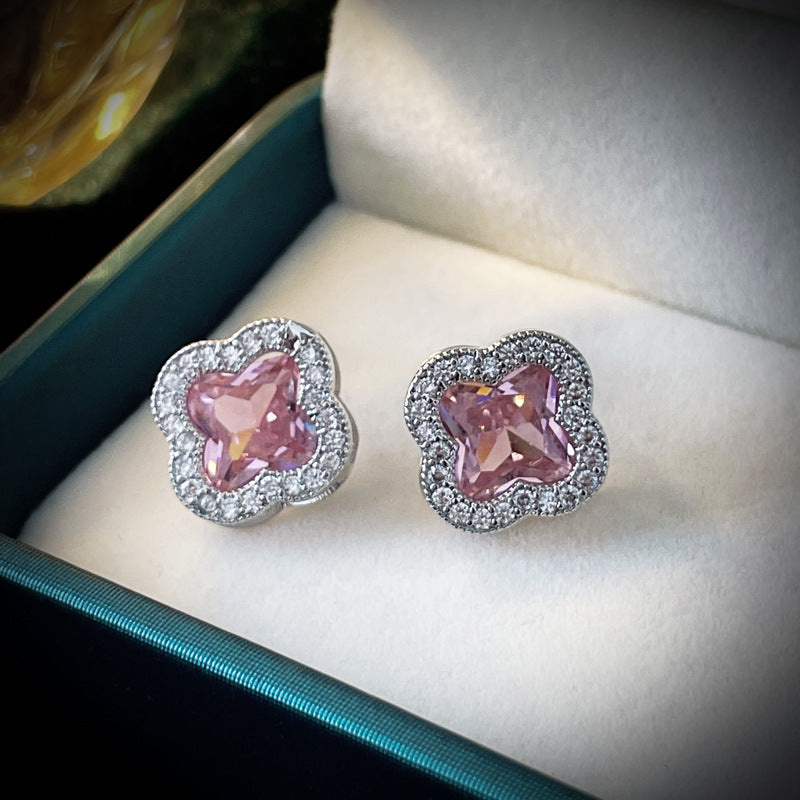 A198 Elegant Diamond Four-Leaf Flower Earrings, Pink Zircon Sterling Silver Needle Niche Style Ear Studs