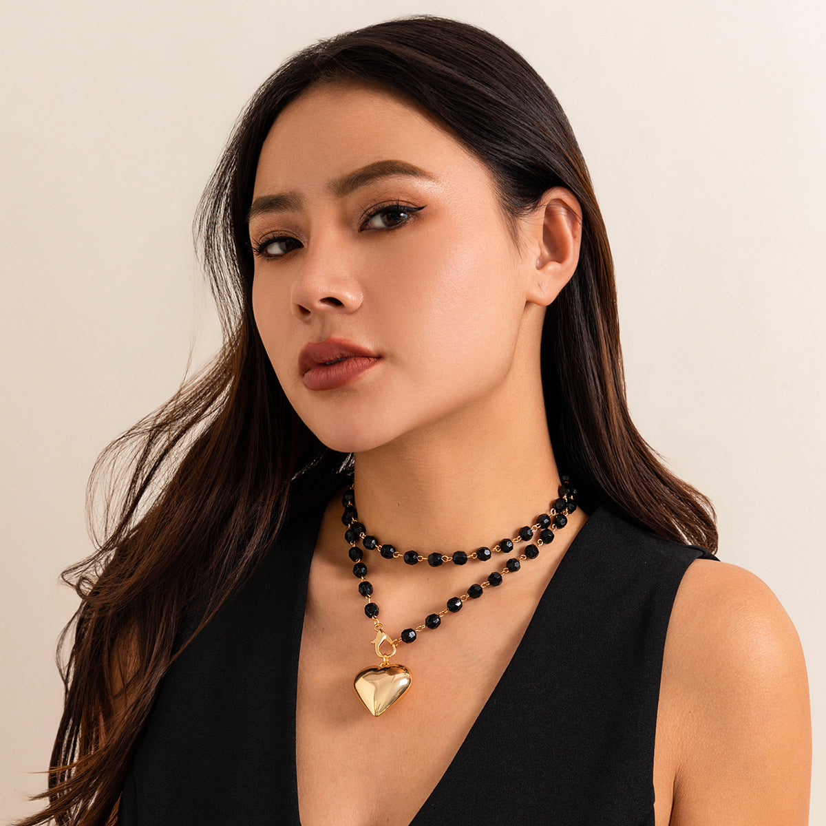 A189 Fashion Sweet Cool Black Beaded Choker, Crystal Heart Long Layered Necklace for Women