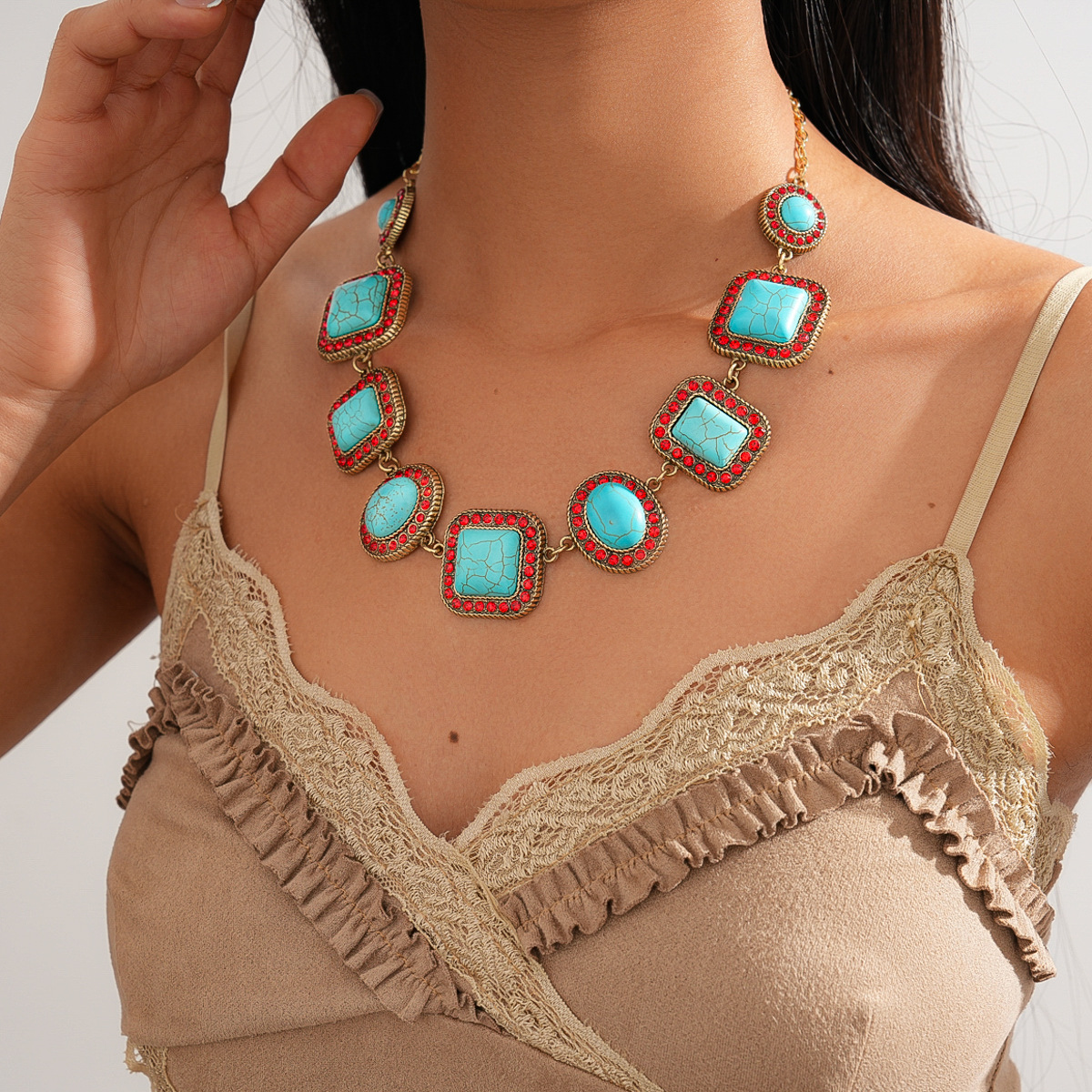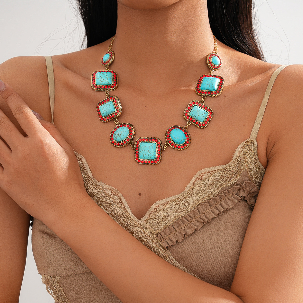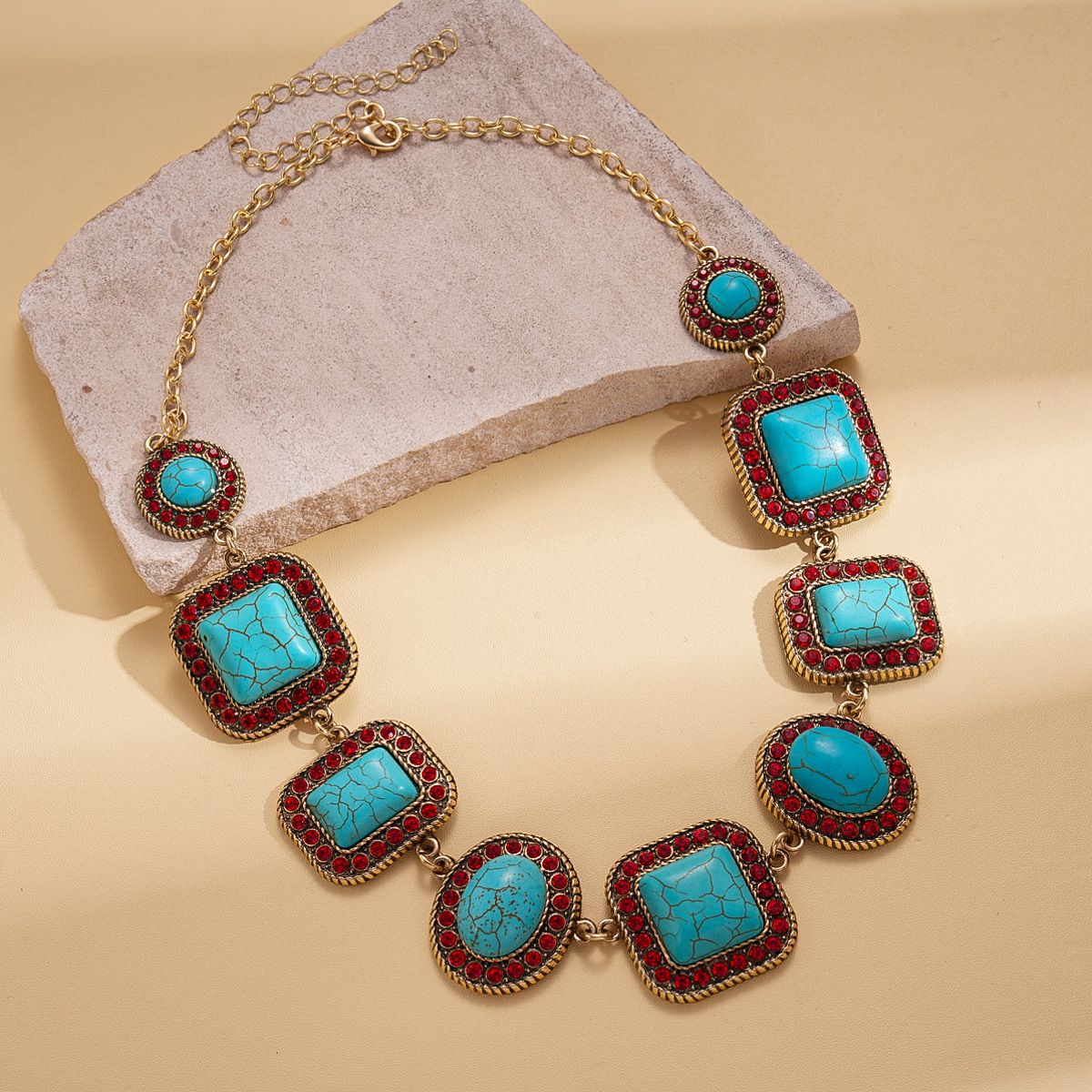 A193 Luxury High-Grade Ethnic Stone Rhinestone Necklace, Geometric Splicing Boho Vintage Sweater Chain